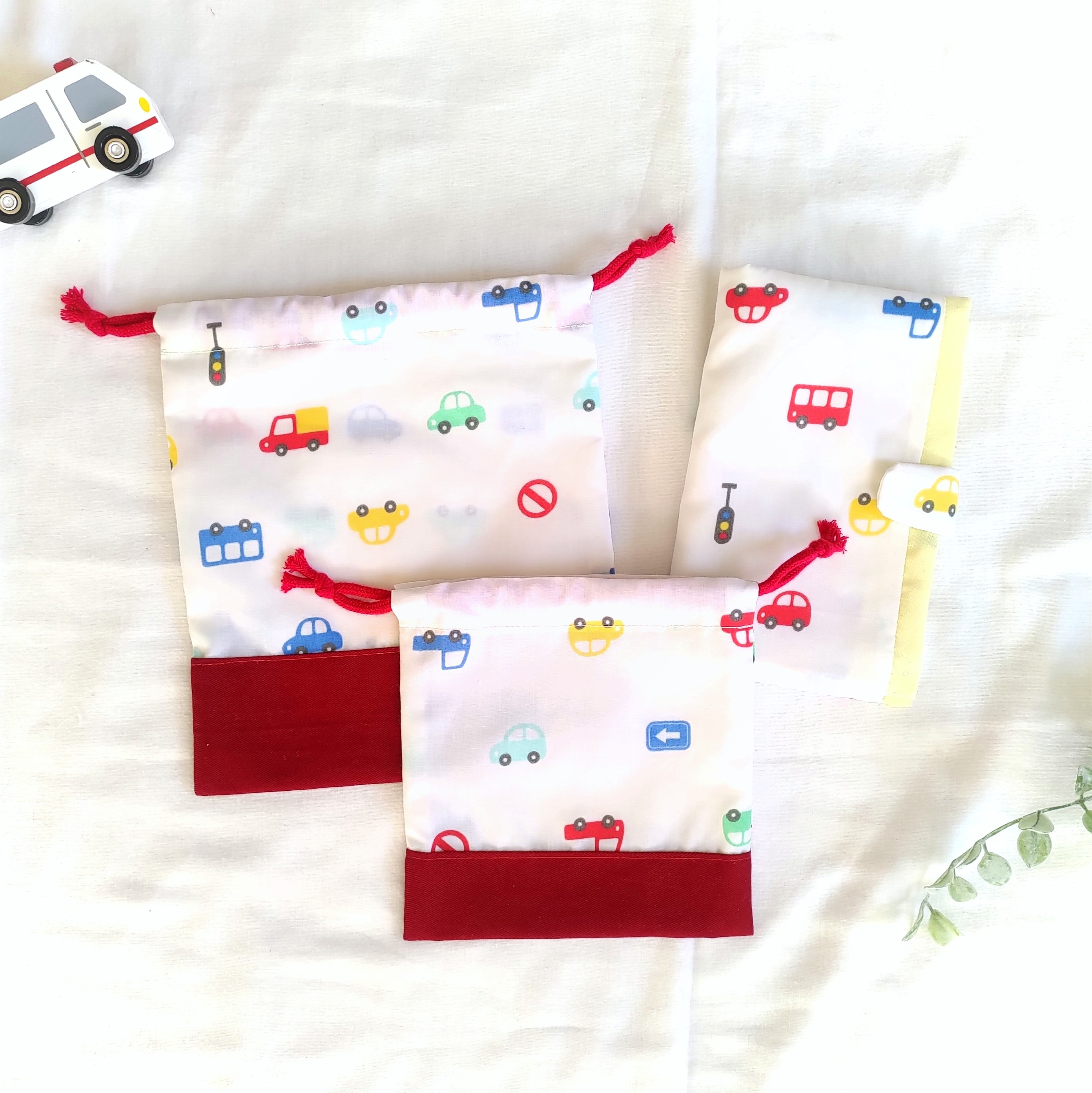 巾着袋は底が丈夫になるように厚手生地で、保育園や幼稚園でも使えるようにかっこいい赤との配色にしてみました。